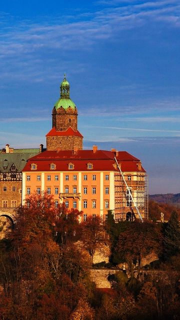 Picturesque view of the side stairwells and mid-section wall of Książ Castle. Photo by Дмитрий Лукутин / AdobeStock.